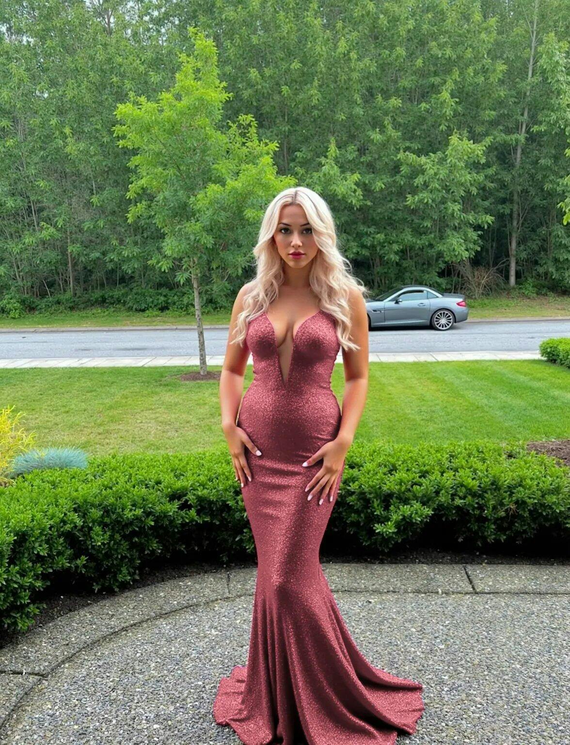 Shine with stunning elegance in this silver glitter mermaid prom dress. The deep V-neckline adds a bold, flattering touch, while the backless design creates a dramatic, sophisticated silhouette. The fitted mermaid shape hugs your curves beautifully, and the allover glitter finish ensures you sparkle from every angle. Perfect for prom, galas, or formal events, this gown combines glamorous allure with modern sophistication for a truly unforgettable look.