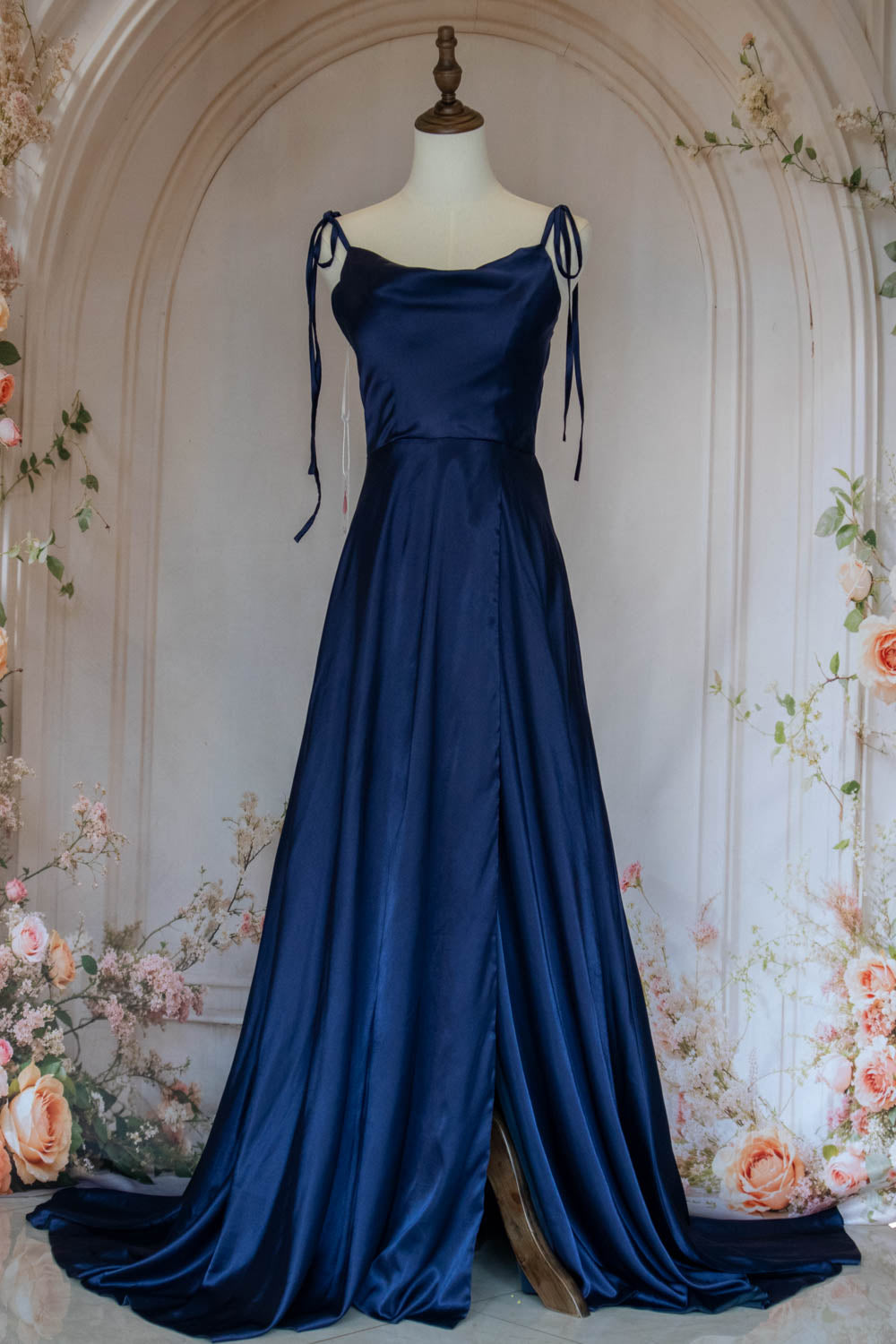This dress perfectly interprets the fashion and charm of modern women with its elegant design and classic colors. The A-line version cleverly modifies the body shape, and the thin shoulder strap design not only shows the feminine shoulder line, but also maintains the overall refreshing feeling. The choice of navy blue not only highlights the noble temperament, but also is easy to match with various accessories. The front slit design adds a touch of sexiness and agility to this dress, whether it is a ball, dinner or other formal occasions, it can make you the focus of everyone's attention.
