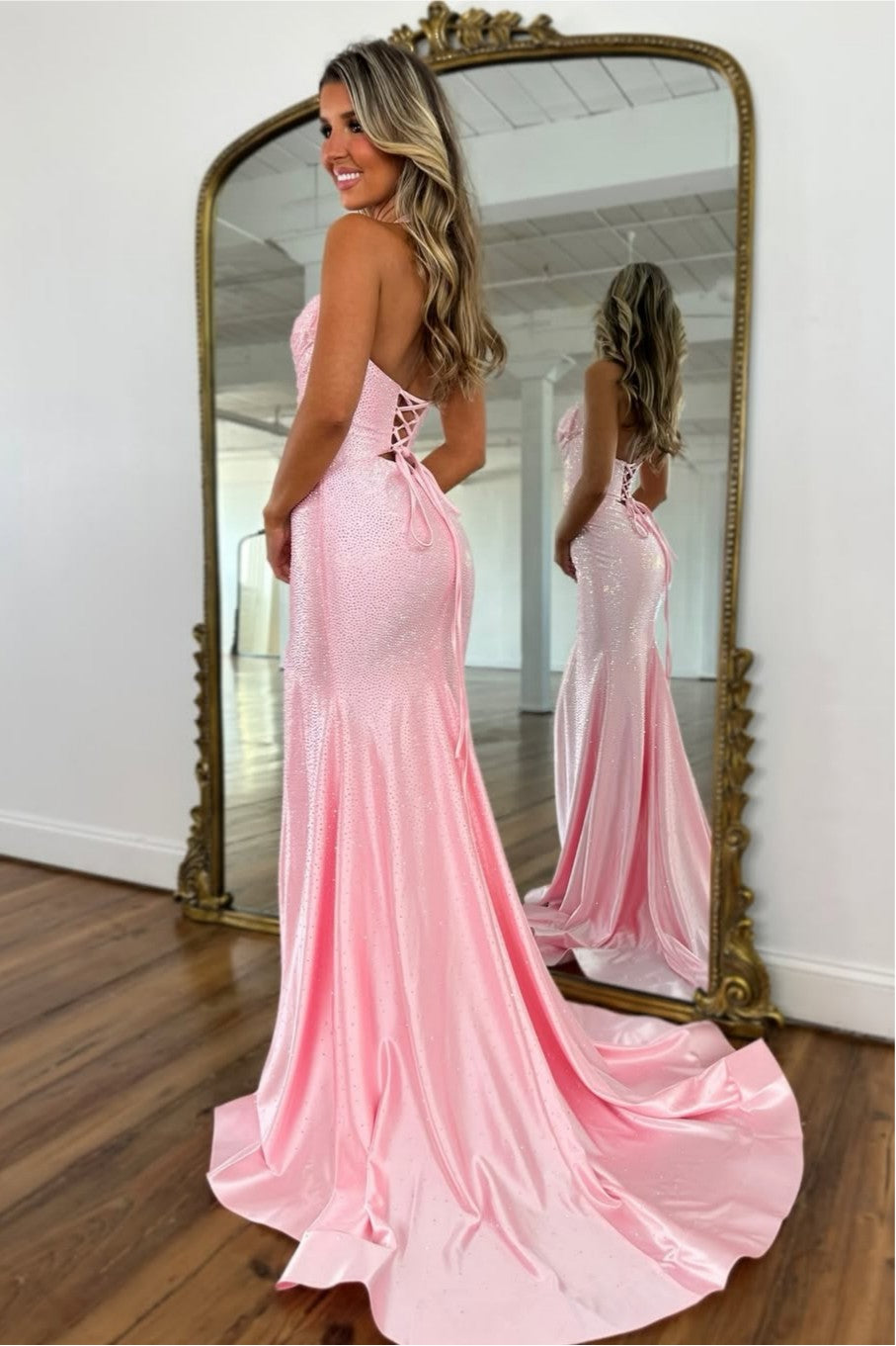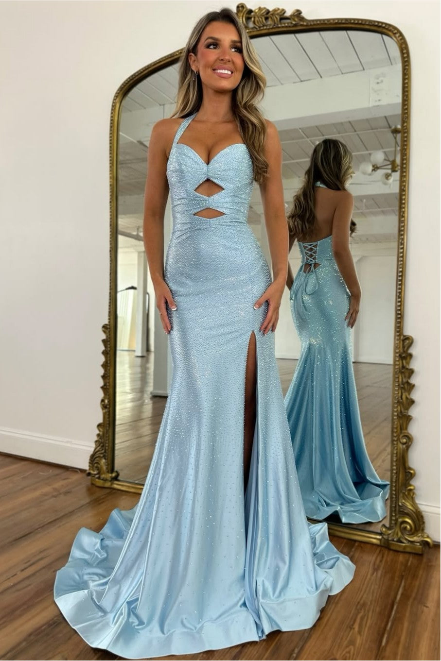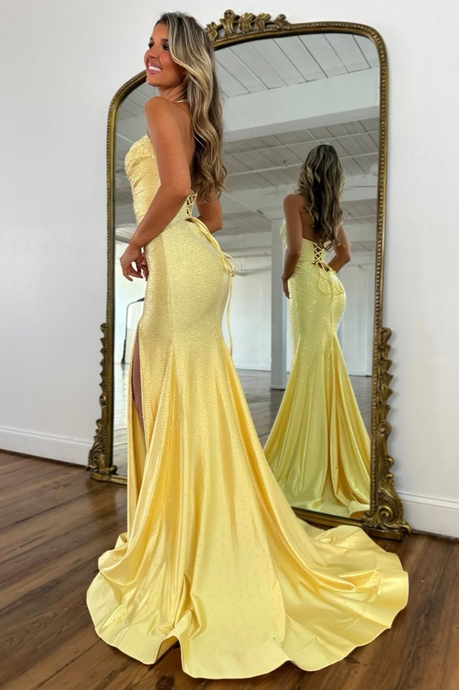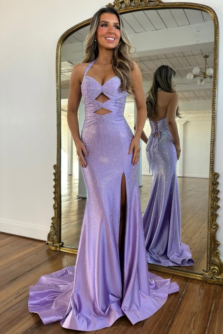 Make a dazzling entrance in this sparkly halter neck mermaid prom dress. The halter neckline beautifully highlights the shoulders, while intricate beading adds eye-catching shimmer and glamour. The fitted mermaid silhouette accentuates your curves, and the lace-up back provides adjustable support for a perfect, figure-flattering fit. Ideal for prom, formal events, or special occasions, this gown combines modern elegance with sparkling sophistication.
