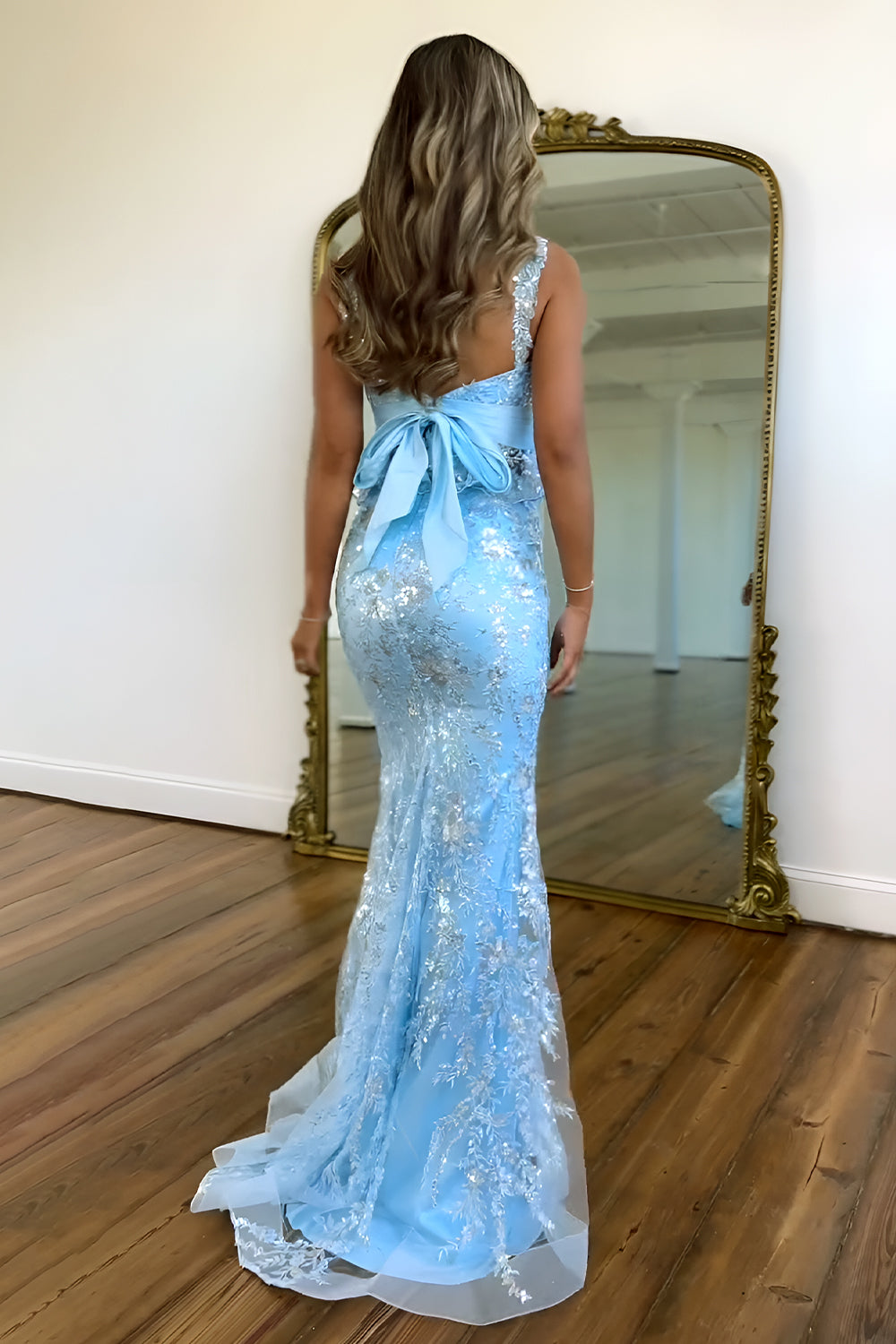 Dazzle in this light blue mermaid prom dress adorned with sparkling sequins and delicate lace. The fitted silhouette accentuates your curves, while a playful ruffle peplum and bow back add feminine charm. Perfect for prom, galas, or any special event where you want to shine with elegance and style.