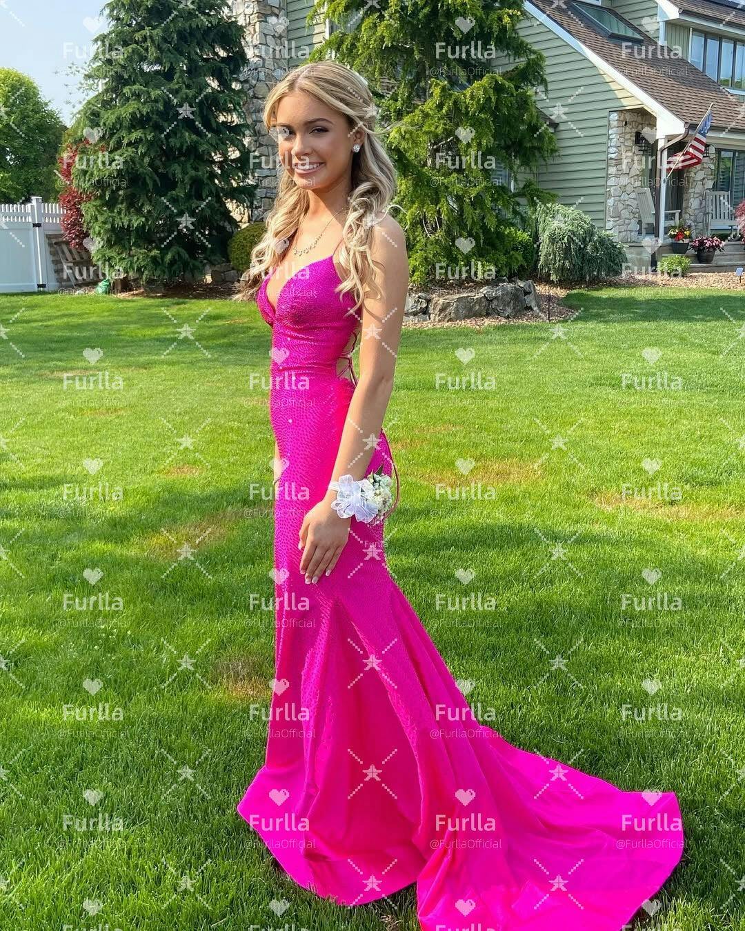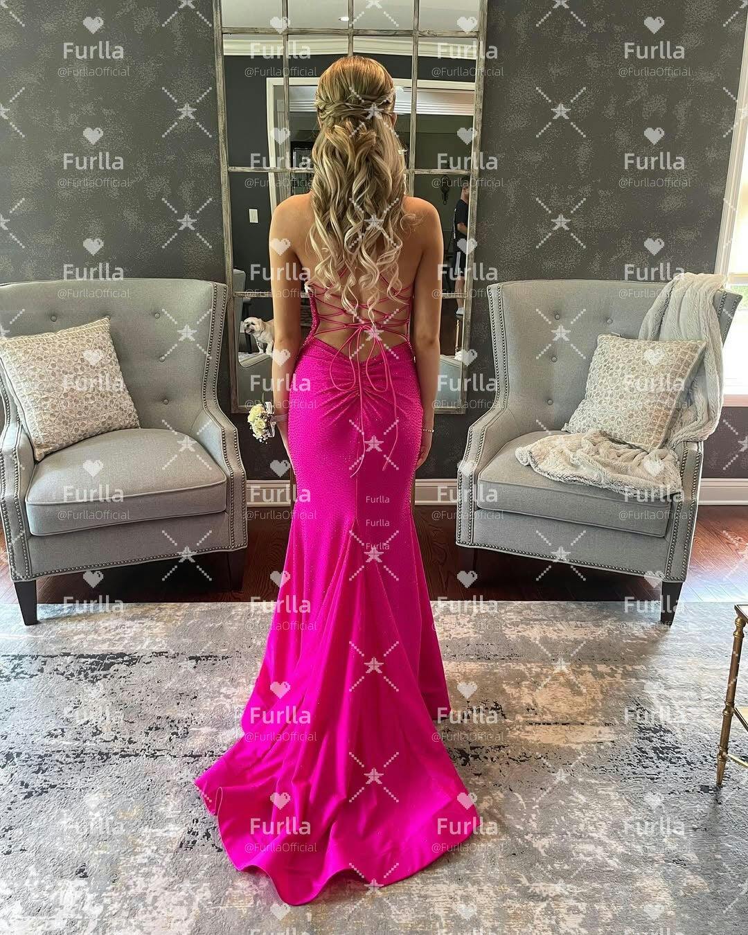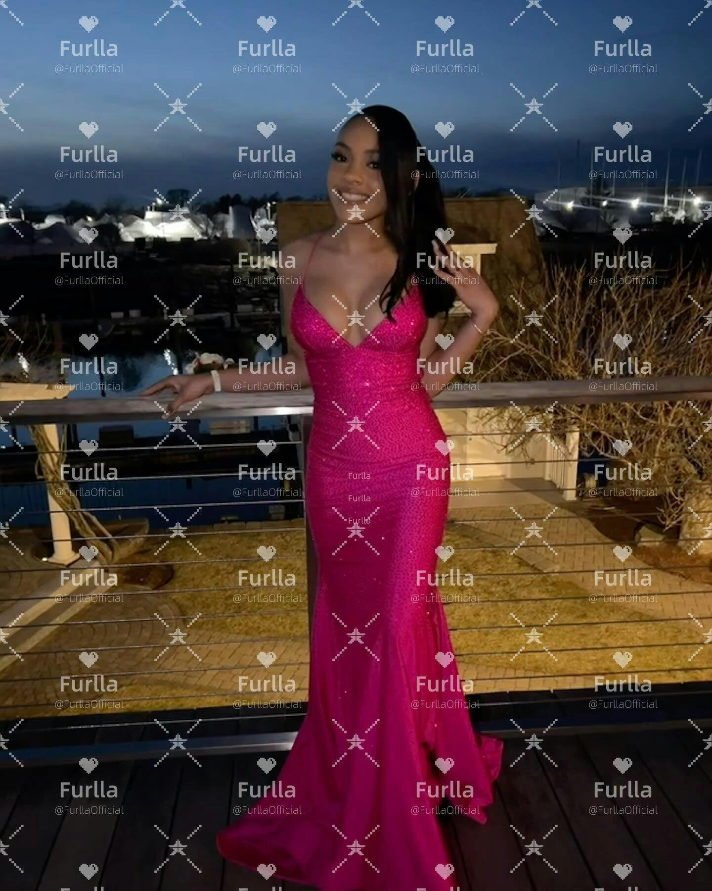 Shine bright in this sparkly mermaid party dress. Featuring delicate spaghetti straps and a figure-hugging mermaid silhouette, it beautifully accentuates your curves. Crafted in vibrant hot pink, the long skirt is adorned with sparkling beadwork that catches the light with every step. Perfect for parties, evening events, or special occasions, this dress blends bold color with glamorous elegance.