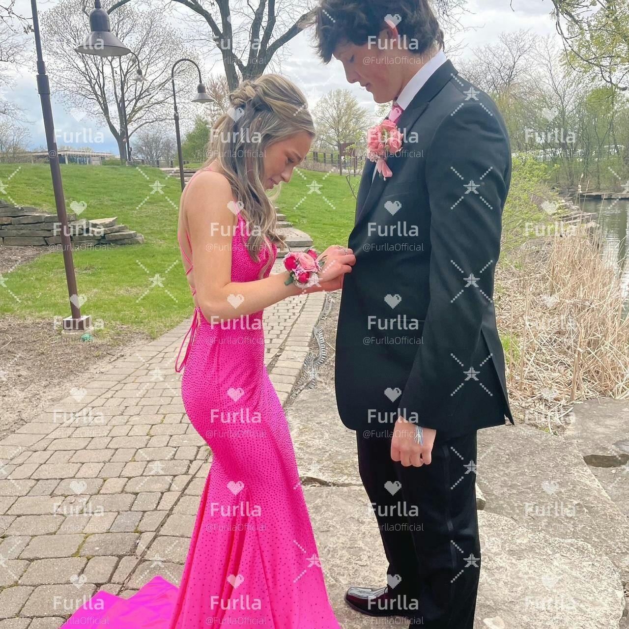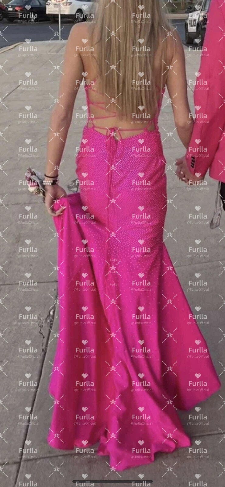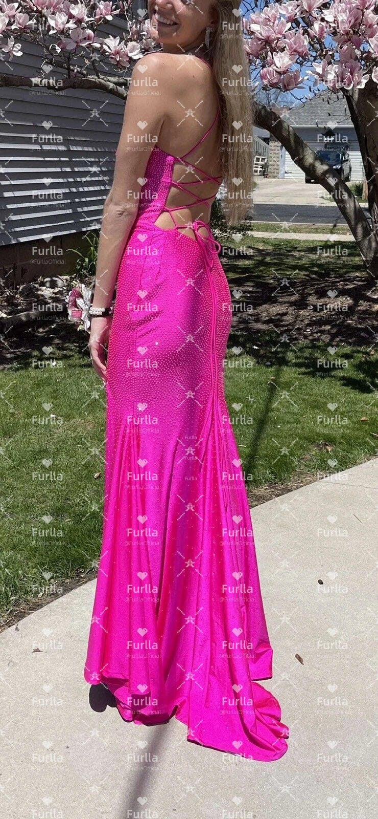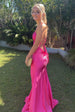 Shine bright in this sparkly mermaid party dress. Featuring delicate spaghetti straps and a figure-hugging mermaid silhouette, it beautifully accentuates your curves. Crafted in vibrant hot pink, the long skirt is adorned with sparkling beadwork that catches the light with every step. Perfect for parties, evening events, or special occasions, this dress blends bold color with glamorous elegance.