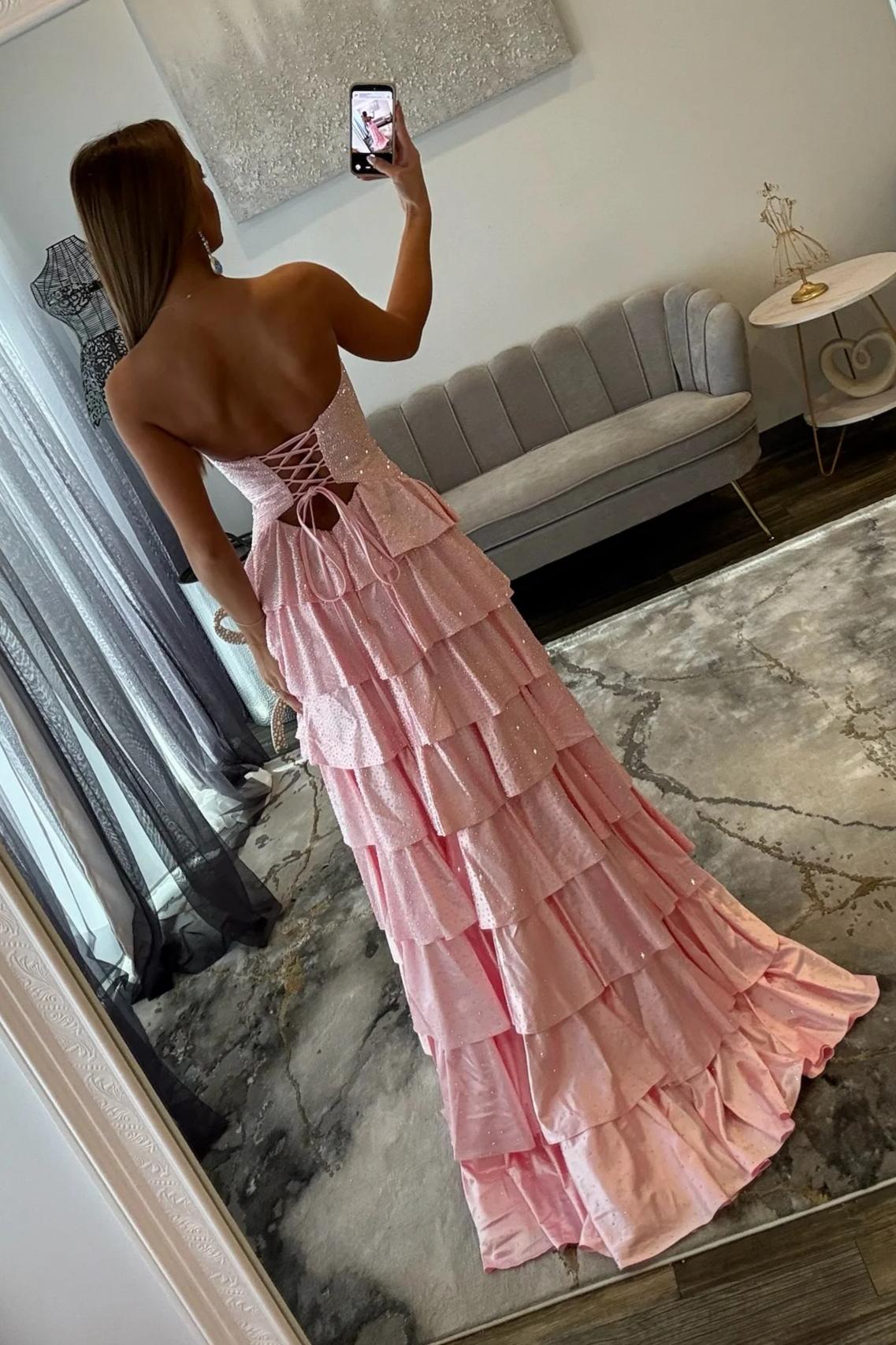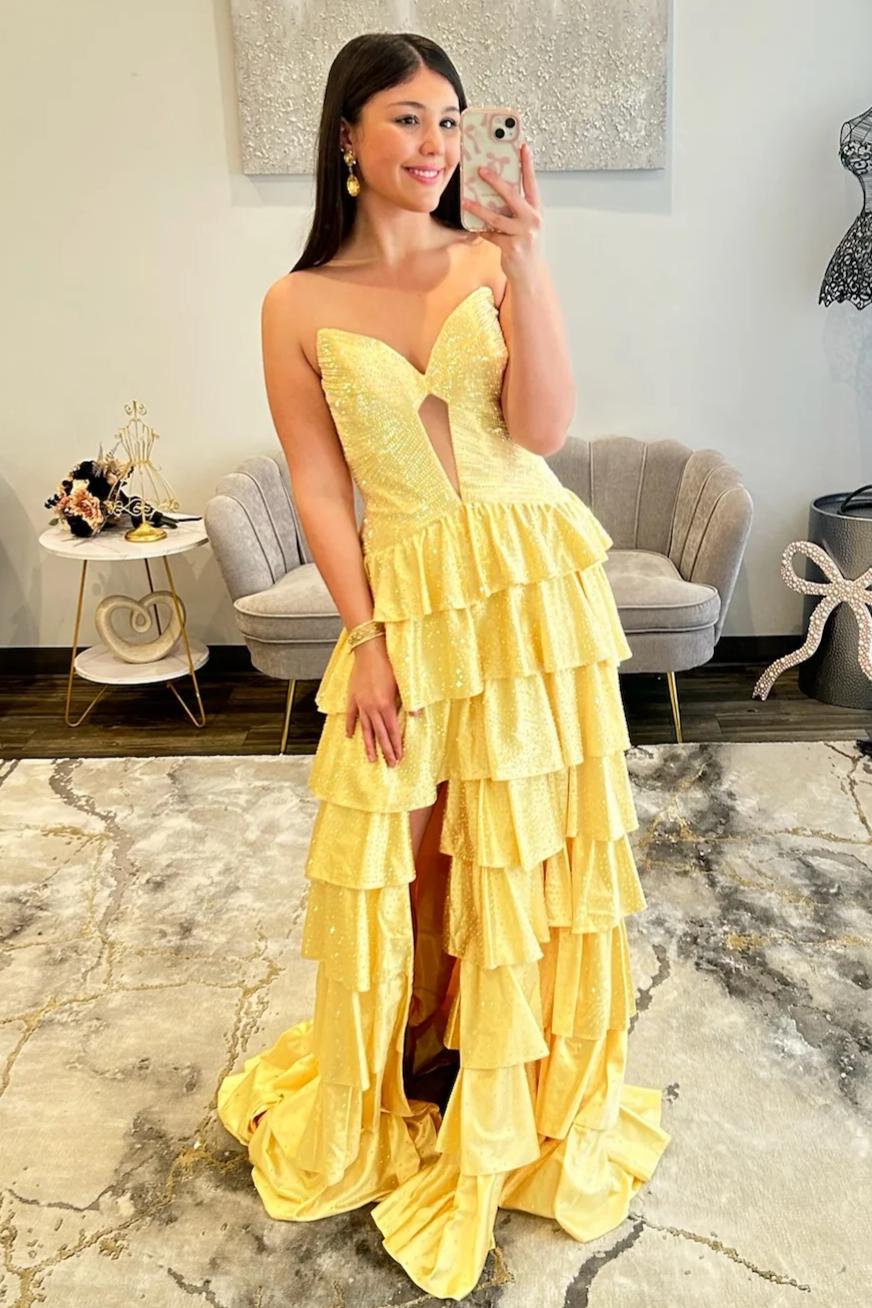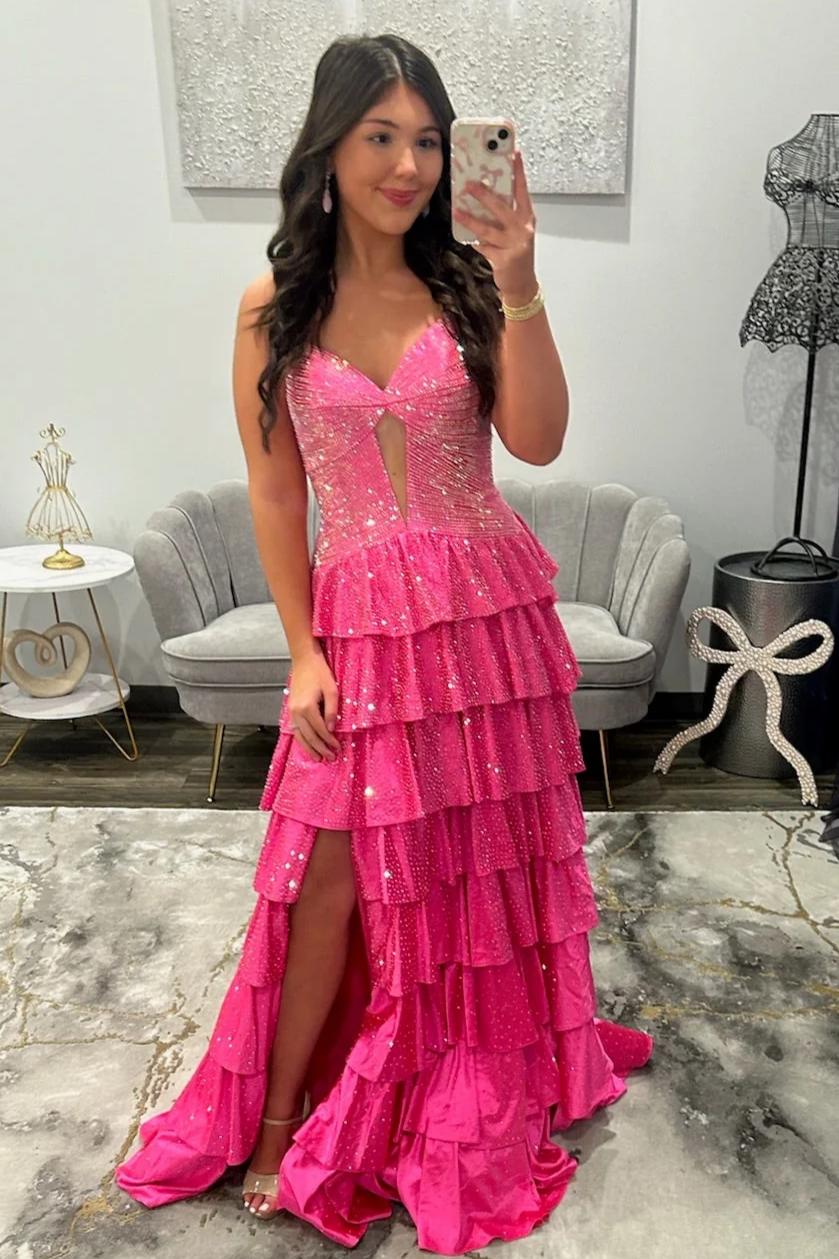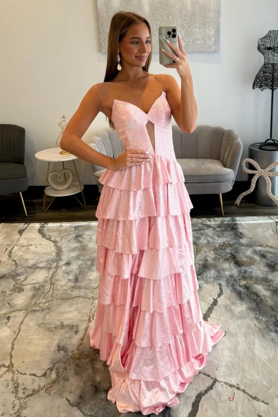 This Sparkly Red Strapless Lace-Up Tiered Ruffle Prom Dress with Cutout and Slit features a bold strapless neckline and a lace-up back that creates a flattering, adjustable fit. Shimmering fabric adds eye-catching sparkle, while the tiered ruffle skirt brings dramatic volume and movement. Finished with a stylish cutout detail and a sleek slit for modern allure, this vibrant red gown is perfect for prom and special occasions where confidence and glamour take center stage.