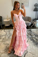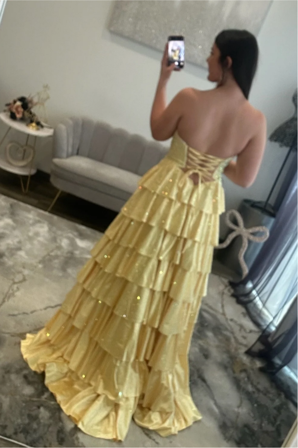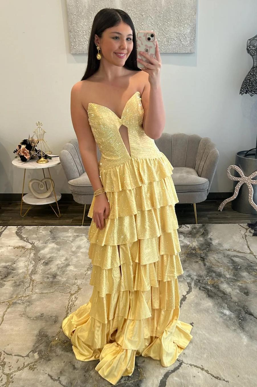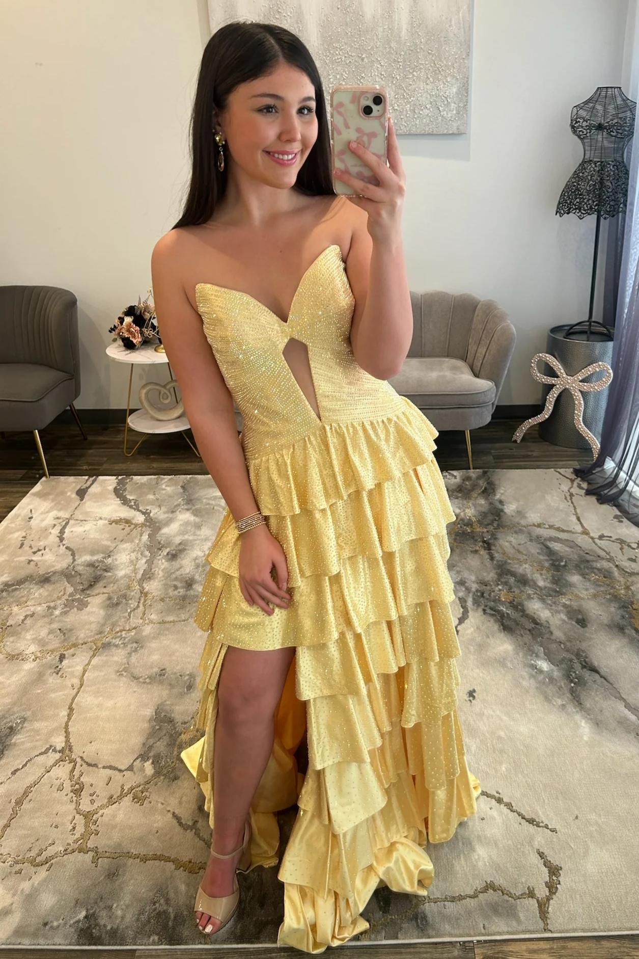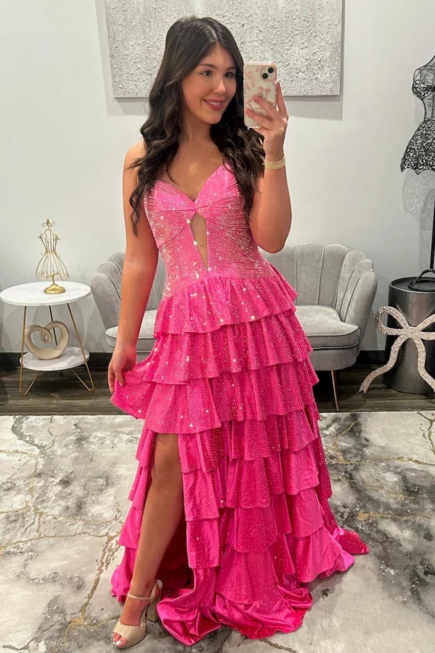 This Sparkly Red Strapless Lace-Up Tiered Ruffle Prom Dress with Cutout and Slit features a bold strapless neckline and a lace-up back that creates a flattering, adjustable fit. Shimmering fabric adds eye-catching sparkle, while the tiered ruffle skirt brings dramatic volume and movement. Finished with a stylish cutout detail and a sleek slit for modern allure, this vibrant red gown is perfect for prom and special occasions where confidence and glamour take center stage.