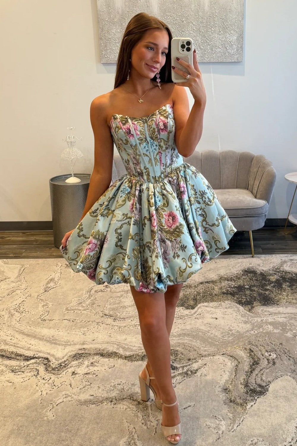 Step into timeless beauty with this Strapless A-Line Floral Print Corset Homecoming Dress featuring a structured corset bodice, a romantic strapless neckline, and a flared skirt that moves gracefully with every step. The soft floral print adds a touch of charm, making it perfect for homecoming, spring parties, or any occasion where you want to feel effortlessly elegant and feminine.