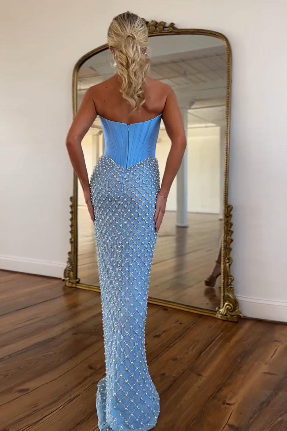 Turn heads in this elegant blue strapless prom dress, designed with a structured corset bodice that enhances and supports your silhouette. Delicate pearl beading adds a touch of luxury, while the high slit brings modern allure and graceful movement. The fitted design flows beautifully into a sleek skirt, making this gown a perfect choice for prom night or any formal evening event.