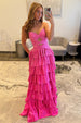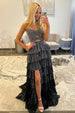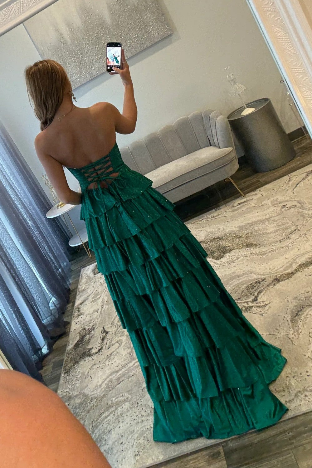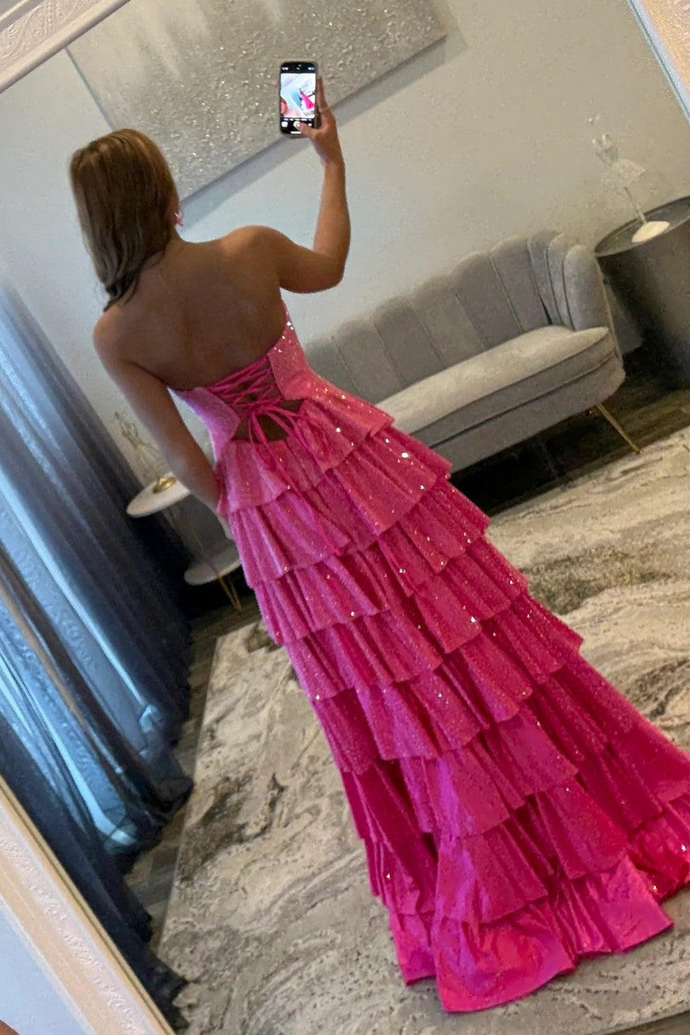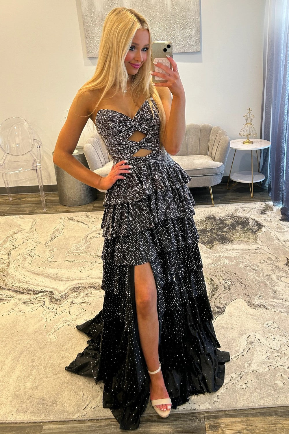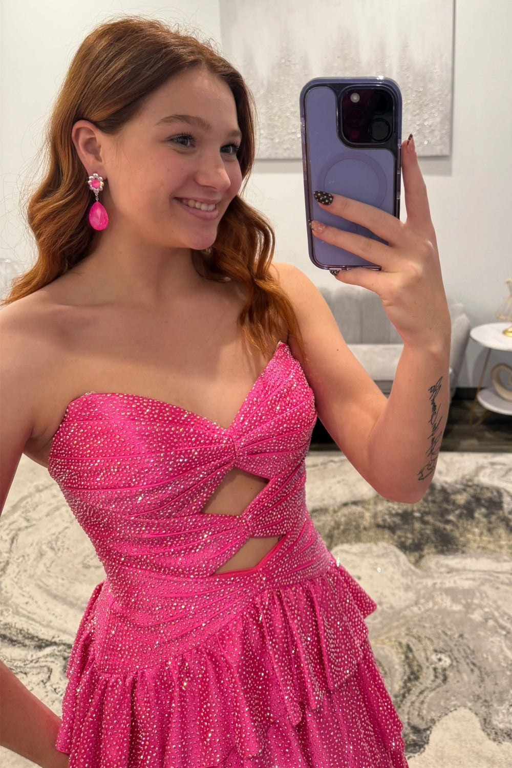 Turn heads in this breathtaking strapless prom dress featuring intricate hot fix embellishments that shimmer from every angle. The keyhole bodice adds a daring touch of sophistication, while the ruffle skirt cascades beautifully with every step. A daring high slit enhances movement and allure, and the lace-up back offers both adjustable comfort and an elegant finish. Perfect for the girl who wants to shine confidently all night long.