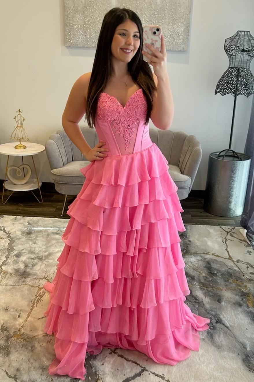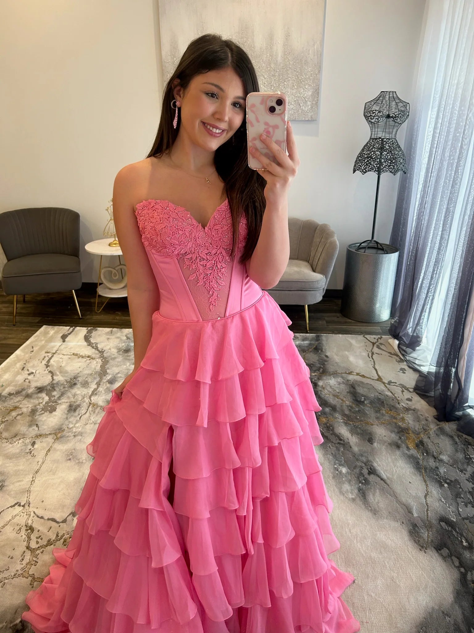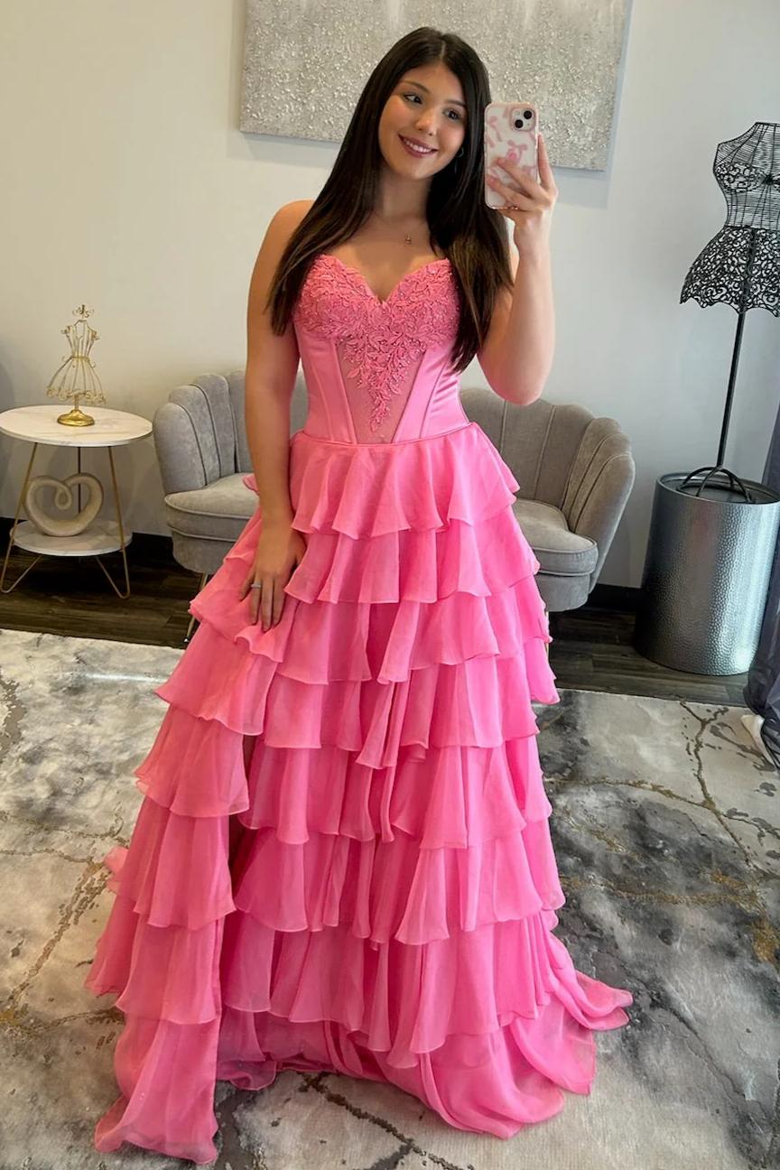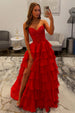 This Stunning Red A-Line Sweetheart Long Tiered Chiffon Prom Dress with Slit features a romantic sweetheart neckline and a flowing A-line silhouette that flatters every figure. The lightweight chiffon skirt cascades in elegant tiers, creating soft movement and graceful volume, while the stylish slit adds a modern, alluring touch. Finished in a bold red hue, this gown is perfect for prom, formal events, and special occasions where confidence and timeless elegance shine.