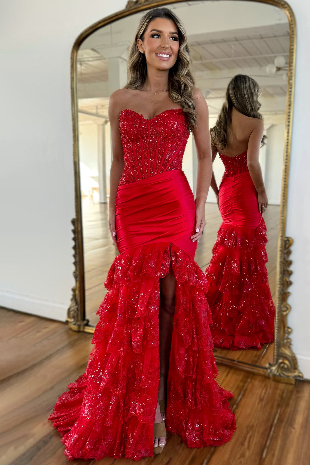 Make a dramatic entrance in this Stunning Strapless Mermaid Satin Prom Dress. Featuring a sleek, figure-hugging bodice and a glamorous tiered sequin ruffle skirt, this gown blends timeless elegance with bold sparkle. The strapless neckline adds a touch of sophistication, making it the perfect show-stopping choice for prom or any unforgettable evening.