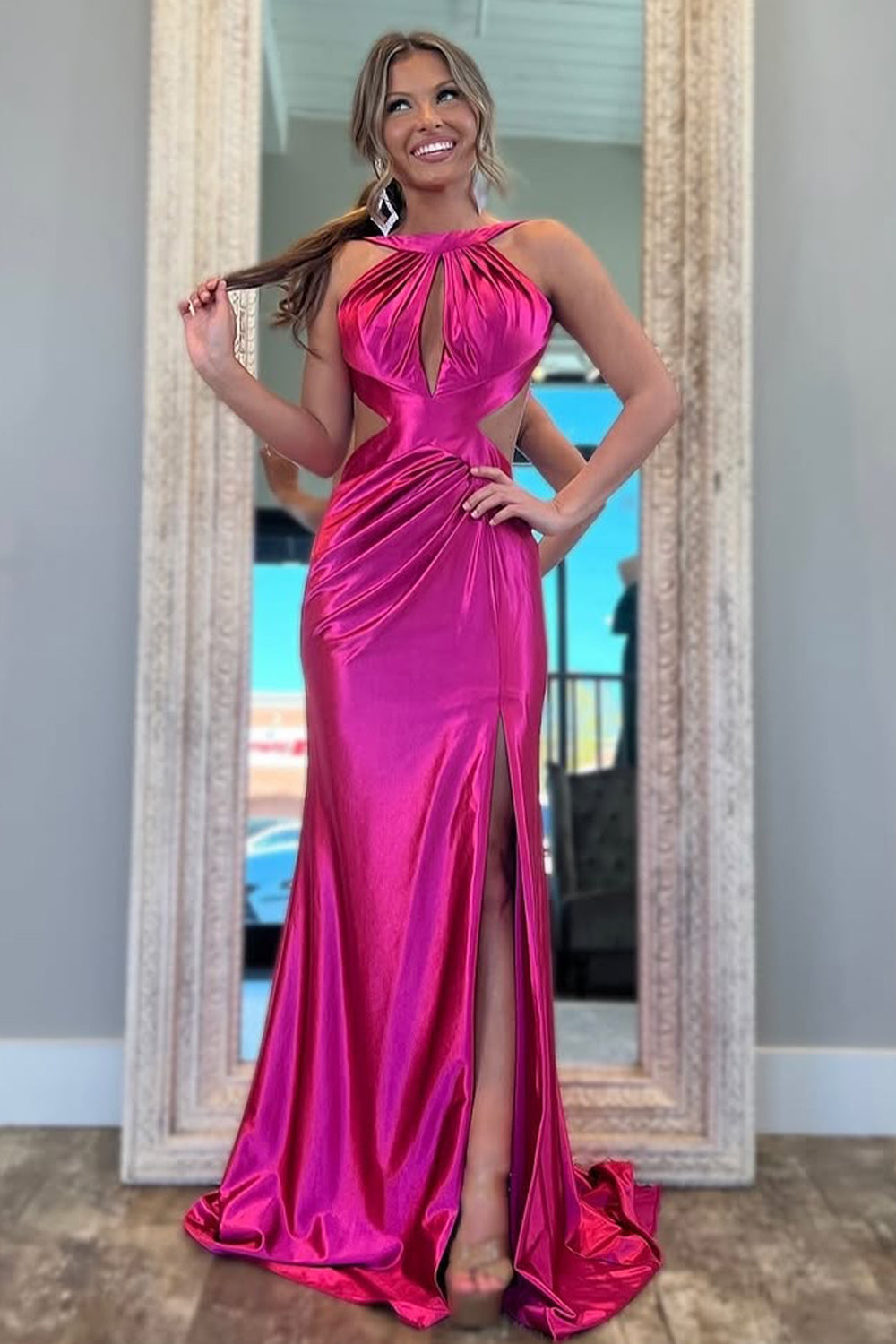 Flaunt your figure in this stunning fuchsia metallic mermaid prom dress. The shiny finish, open back, and high slit combine to create a look that’s both daring and elegant. Perfect for those who want to make a bold entrance, this gown blends a modern edge with timeless prom glamour. Step out in style and leave a lasting impression.