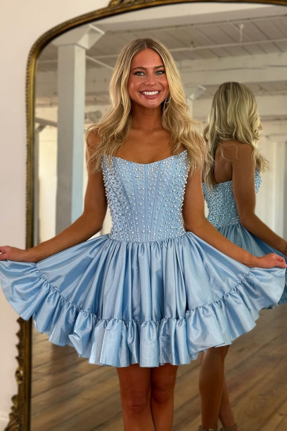 Add a touch of romance with this Sweet Pink A-Line Strapless Short Satin Homecoming Dress featuring a smooth satin finish, delicate pearl embellishments, and a flattering strapless neckline. The A-line silhouette offers graceful movement, making it the perfect choice for homecoming, parties, or any special occasion where you want to feel feminine and elegant.