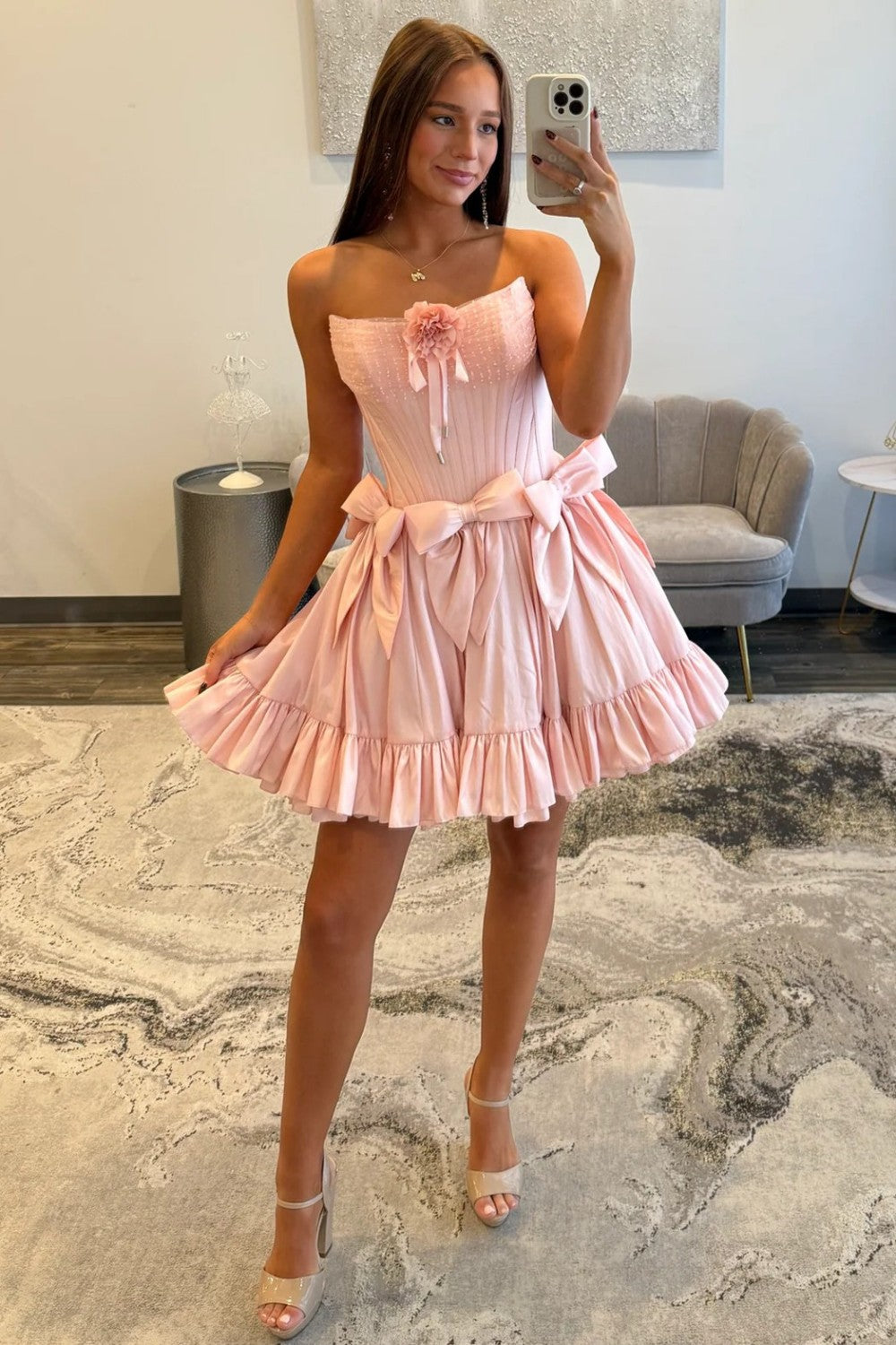 Embrace your feminine side in this Sweet Pink Strapless Corset Homecoming Dress featuring a structured bodice for a flattering fit, dainty bow accents, and a playful ruffle hem that adds movement and charm. The soft pink hue and flirty details make it the perfect choice for homecoming, parties, or any occasion where you want to feel pretty and confident.