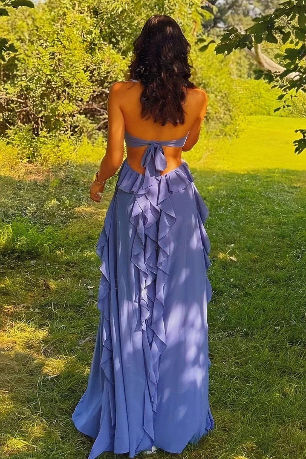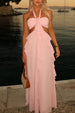 Fall in love with the playful elegance of this Sweety A-Line Halter Neck Pink Long Prom Dress with Keyhole Ruffles. The halter neckline beautifully frames the shoulders and creates a flattering, modern look, while the charming keyhole detail adds a hint of allure. Flowing from the waist, the A-line silhouette offers graceful movement and a universally flattering fit. Soft ruffle accents bring romantic texture and lightness to the design, perfectly complementing the sweet pink hue. Feminine, stylish, and full of charm, this gown is made to make your prom night truly unforgettable.