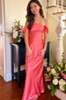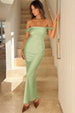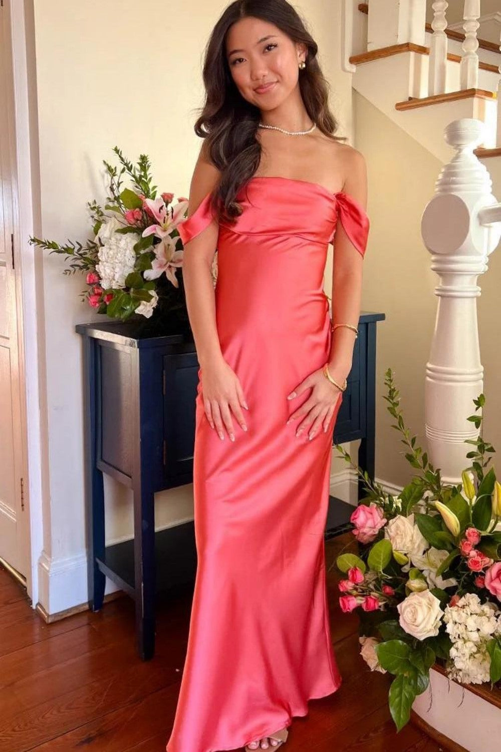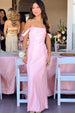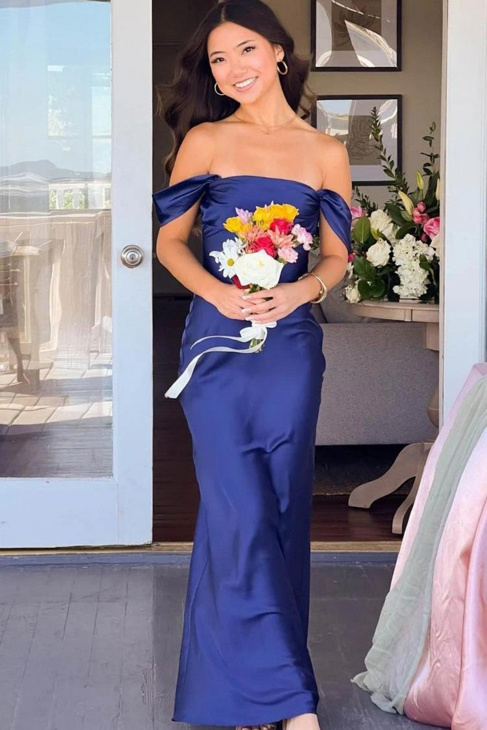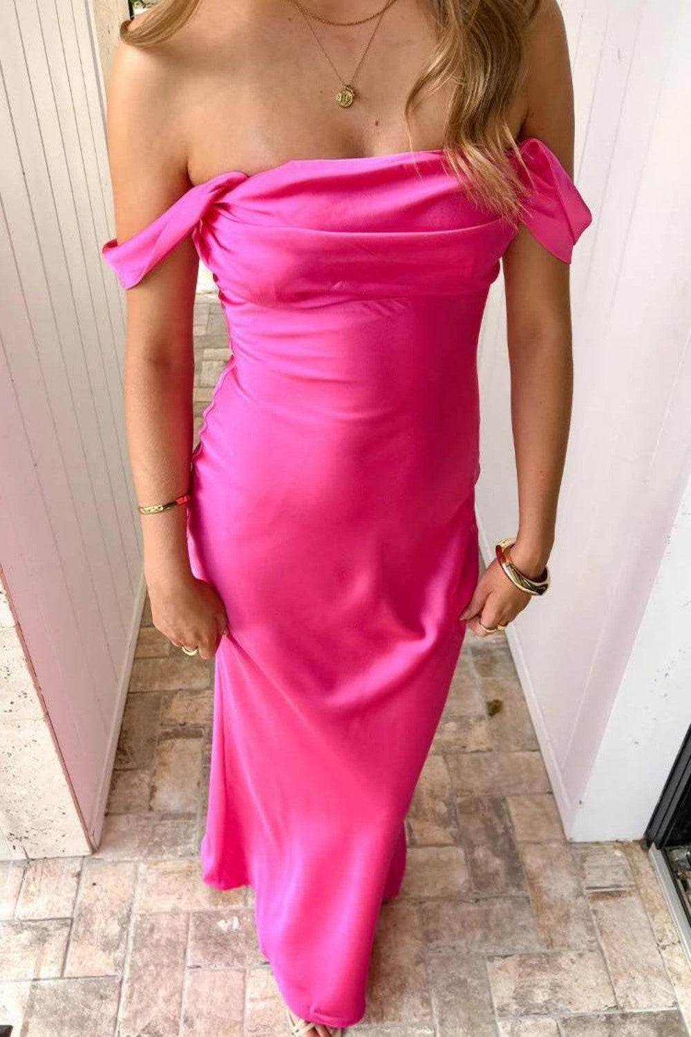 This stunning gown blends modern elegance with a soft, romantic vibe. The off-the-shoulder neckline highlights your collarbones beautifully, while the sleek sheath silhouette enhances your natural curves for a sophisticated, runway-ready look. Gentle ruching adds texture and visual interest, sculpting a flattering fit from every angle.